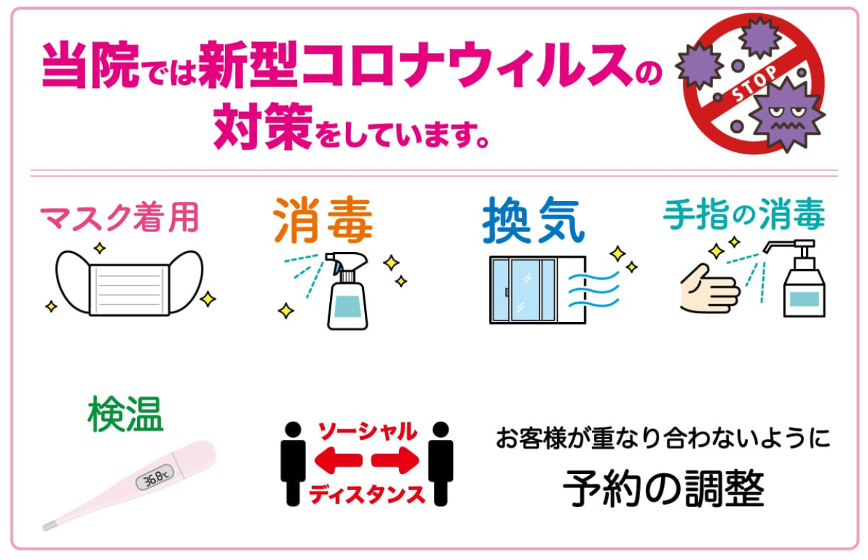 みなさまに安心してご利用いただくため、私たちは日本医師会の「新型コロナウイルス感染症対策チェックリスト」を参考にすべての院でコロナウイルス感染対策を徹底しております。 また、診療時間に関しても通常どおり診療を行っています。
