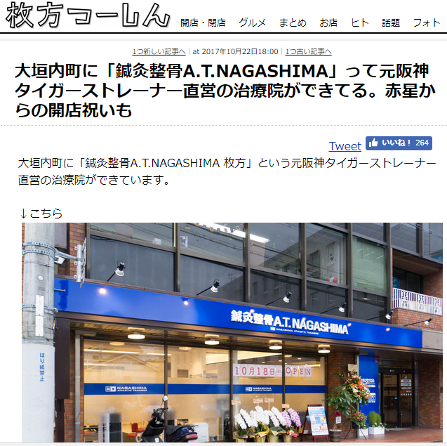 枚方市民に愛される通称ひらつーにオープン間もなく、“運動されている方は要注目の整骨院”と取り上げて頂きました。鍼灸整骨A.T.NAGASHIMA掲載ページへはこちら:http://www.hira2.jp/open/atnagashima-20171022.html